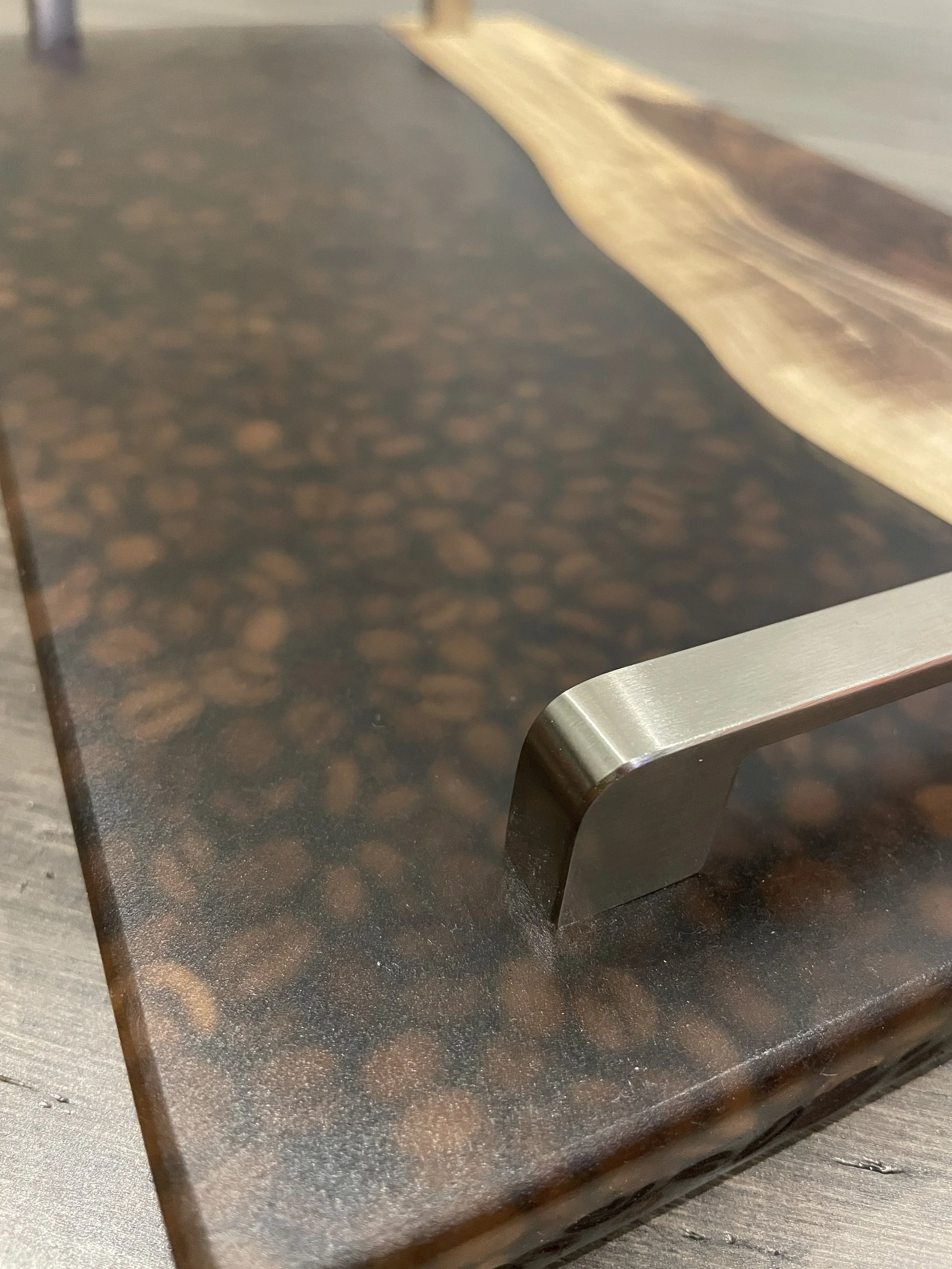 Epoxy Golf Themed Coffee Table - This beautiful coffee table is handmade and crafted from ash wood, giving it a unique and natural look. The tabletop is finished with a layer of clear epoxy, giving it a glossy and durable finish.The glossy finish of the epoxy top and metal legs are easy to clean and maintain, ensuring that this coffee table will last for years to come.